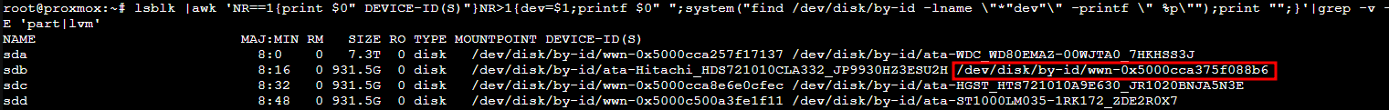 lsblk |awk 'NR==1{print $0" DEVICE-ID(S)"}NR>1{dev=$1;printf $0" ";system("find /dev/disk/by-id -lname \"*"dev"\" -printf \" %p\"");print "";}'|grep -v -E 'part|lvm'
